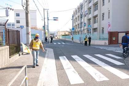 地域の見守り隊の方に、毎日交代で子どもたちの登下校のようすを見守っていただいています。