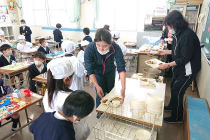 最初のうちは、6年生が給食室から1年生の給食を運んでくれます。