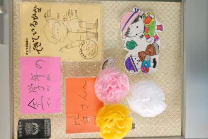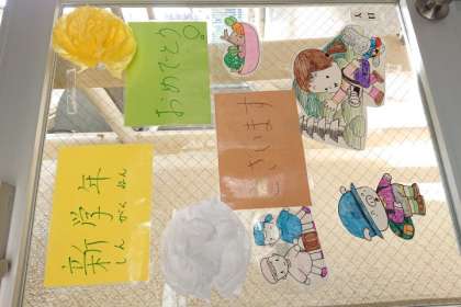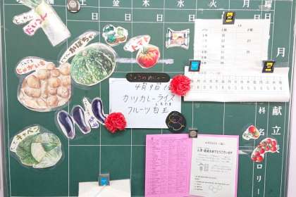 給食調理員が子どもたちの入学・進級をお祝いして、給食室にメッセージを掲示しています。