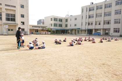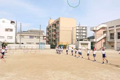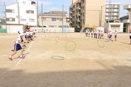 2人ペアで、離れた場所から転がしたり、投げたりしながらフープを受け渡ししています。