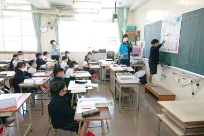子どもたちが前に出て、□に入る数をどのように考えたか、みんなに説明しています。