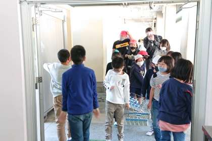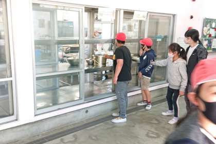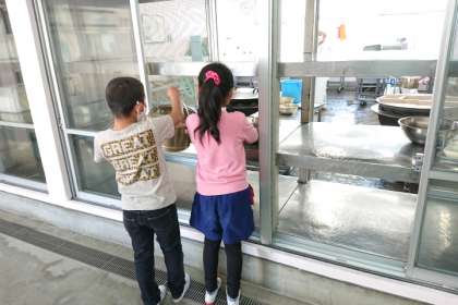 給食後、給食当番の子どもたちが食器や食缶を返しに給食室にやってきました。