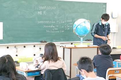 地球儀を使って距離や方位を調べる方法を学習しています。