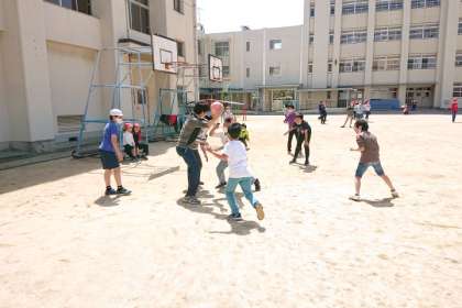 1人の子が「じゃあ、先生対みんなな。!」というと、たくさんの友だちが集まってきました。