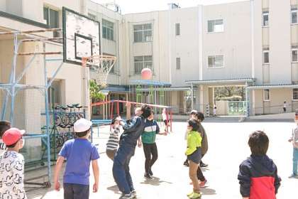 お昼休み、5年生の子どもたちが担任とバスケットボールをして遊んでいました。