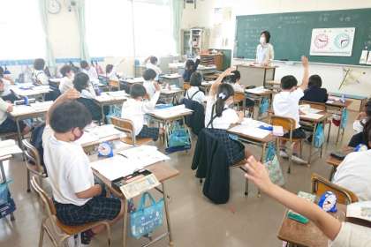 たくさんの子どもたちが手をあげて発表しています。