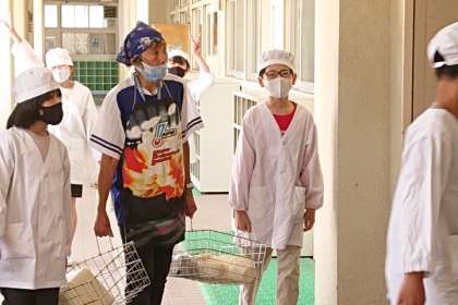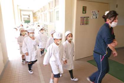 今日も、1年生の給食を6年生が運んできてくれました。