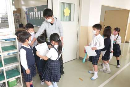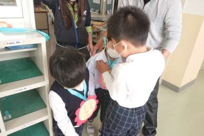 1年生は、2年生に「くびかざりカード」をかけてもらい、校内の特別教室などを回ります。