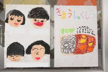給食室前にて。