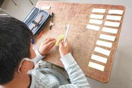 どんなクラスにしたいか、どんな人がたくさんいたらいいのか考えて、クラス目標のキーワードとなる言葉を付せんに書き出しています。