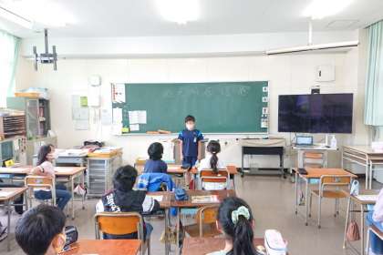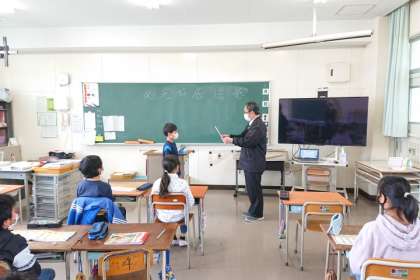 先週の児童朝会で前期児童会役員の認証式をしましたが、欠席した児童に、教室で校長から認証状を渡しました。