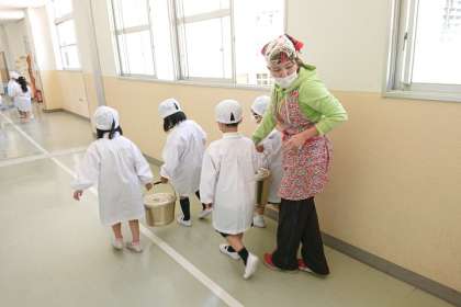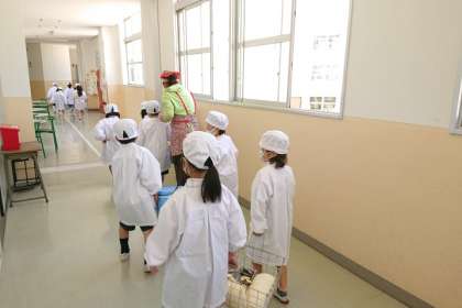4月は、6年生が給食室から給食を運んできてくれましたが、今は1年生が自分たちで運んで準備しています。