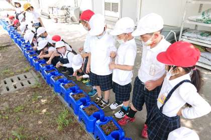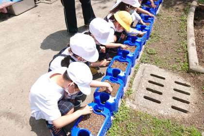 指で土に5か所穴をあけ、それぞれの穴に種を植えていきます。