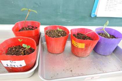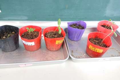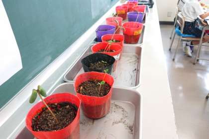 理科の学習で観察しているホウセンカ、マリーゴールド、ヒマワリの芽が出ました。