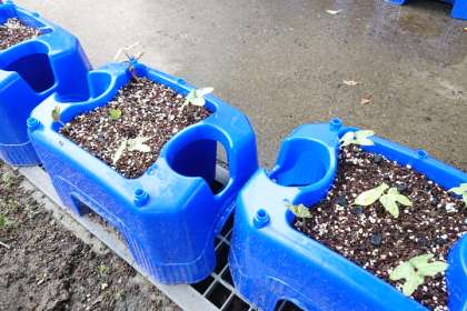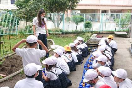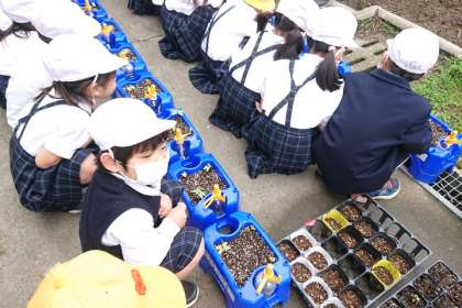 水やり用のペットボトルを置きに来た1年生の子どもたちは、とても喜んでいました。