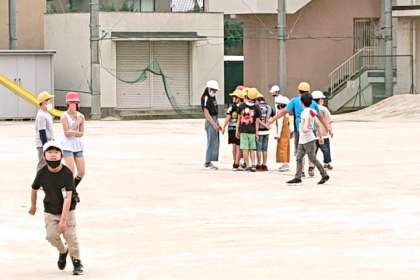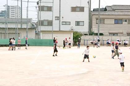 たくさんの子どもたちが運動場に出て遊んでいます。