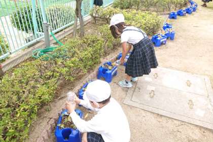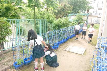1・2年生が、自分が育てているアサガオや野菜に水やりをしています。