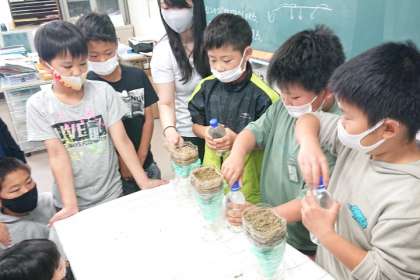 ペットボトルに土を入れ、上から水をかけて、水がしみこんでいくようすを観察しています。