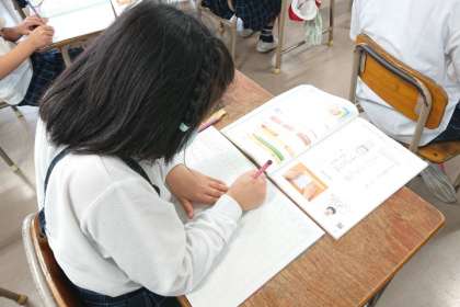 教科書の図のものさしの目盛りを読み取って、えんぴつとクレヨンの長さを調べています。