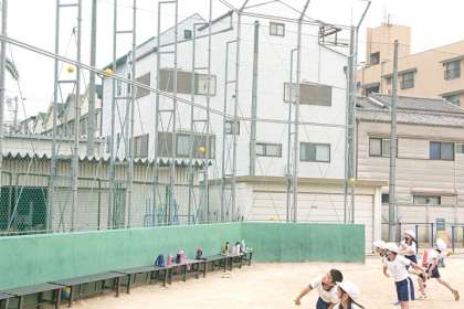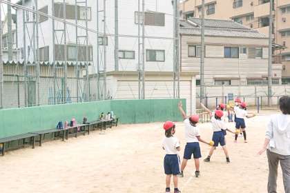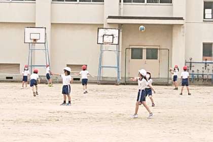 フェンスに向かって、ソフトボールを高く投げる練習や、ペアでドッジボールを投げたり受けたりする練習をしました。