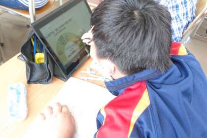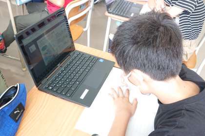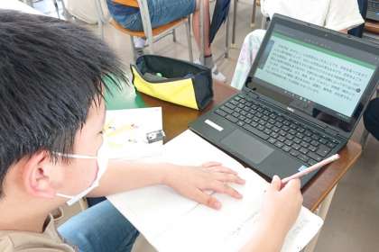 国語科の時間は、1人1台端末を使って、地球温暖化、ごみの減量とリサイクル、河川の水質、大気汚染など、環境問題について調べています。