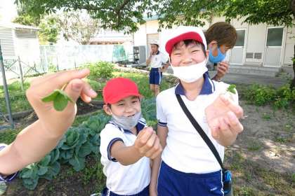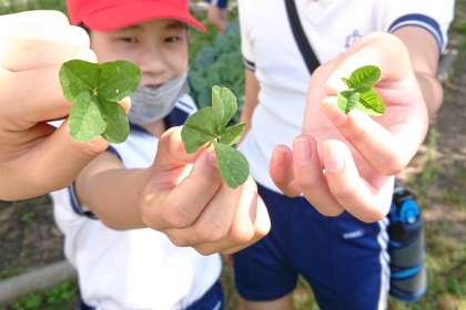 6年生の子どもたちが、学習園の近くの草むらで、四葉のクローバーを探していました。