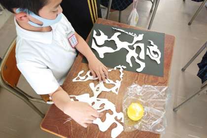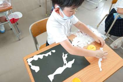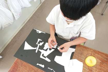 白い紙を切って、黒い画用紙の台紙に貼っていきます。