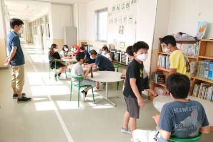 集会委員の子どもたちが集会後に集まり、今日の集会について振り返っています。