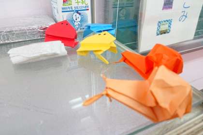 真ん中の写真は、折り紙で作ったかわいいカエルとカタツムリ。