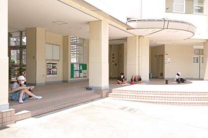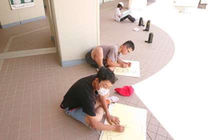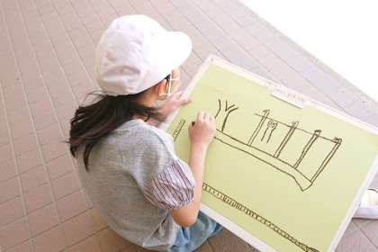 校舎内、運動場、遊具の上・・・子どもたちが思い思いの場所で学校の風景をスケッチしています。