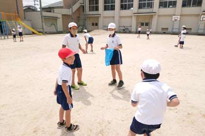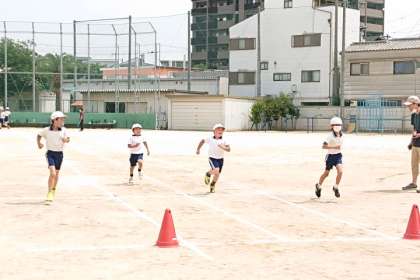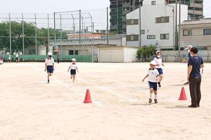 6年生に伴走してもらい、1年生が一生懸命ゴールをめざしています。