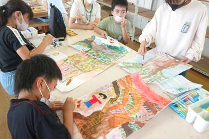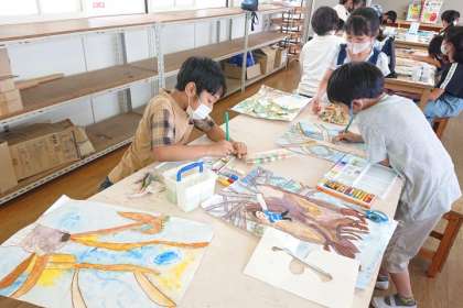 校庭の桜の木を見てコンテで描いた下絵に、絵の具で色をつけていきました。