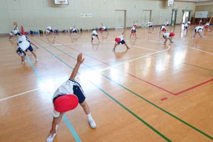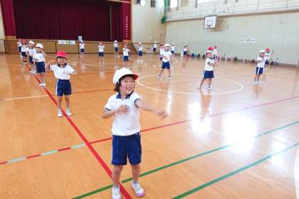 プール学習のときに、プールの中で水慣れのために踊るダンスを練習しています。