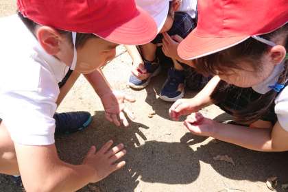 休み時間に、1年生の子どもたちが、校庭の藤棚の近くで何やら探していました。