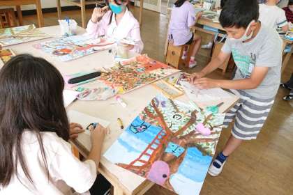校庭の桜の木を見てコンテで描いた下絵に、絵の具で色をつけました。