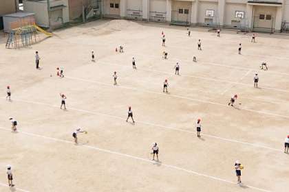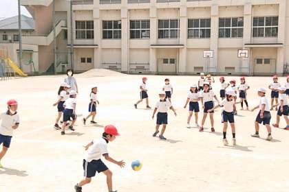 子ども同士の間隔をあけて、投げたり受けたりする練習をしました。
