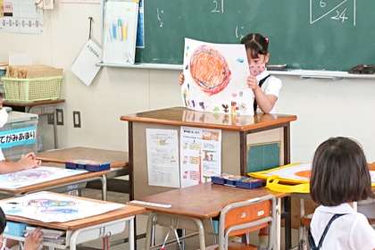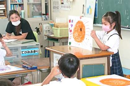 今日は、どんな「おひさま」を描いたか、一人一人みんなの前で発表をしています。