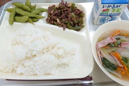 給食室では、調理員がトレイいっぱいの枝豆を見せてくれました。