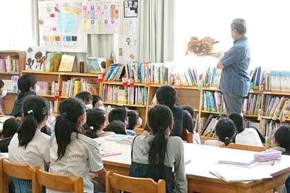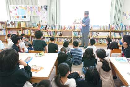 図書室をのぞくと、図書館支援員の方が6年生に絵本「じごくのそうべえ」の読み聞かせをしていました。