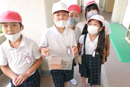 下の写真は、子どもたちがザリガニのお家を作るために、校庭で小石を集めて教室に持って帰るところだそうです。