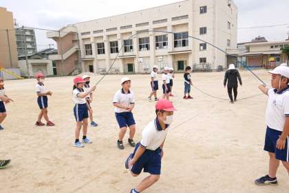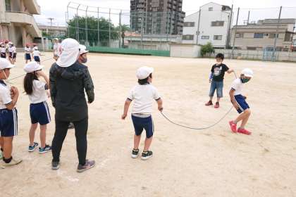 子どもたちがグループに分かれて、大なわとびの練習をしています。