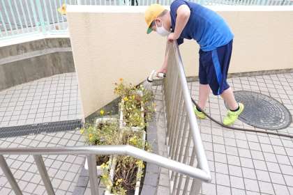 正門付近では、飼育栽培委員会の子どもたちが、毎朝お花に水をあげています。