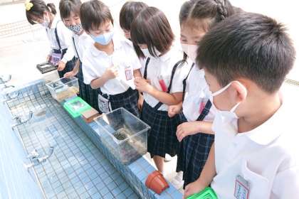 子どもたちはおそるおそるザリガニをつかんでいます。