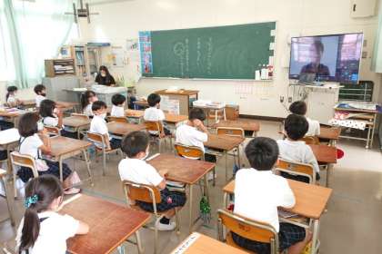 今日の児童朝会は、校長室と各教室を結んでオンラインで行いました。