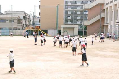 たくさんの子どもたちが運動場に出て遊んでいます。