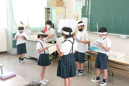 グループで、「きつね」「牛」「大男」など、教材文「名前を見てちょうだい」の登場人物になりきって音読の発表会をしています。