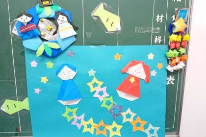 周りにあるおりひめ、ひこぼしや星の形は、児童が作りました。