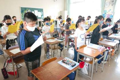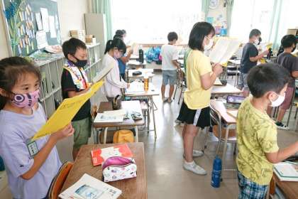 国語科の時間、教科書の教材文「走れ」の音読をしています。