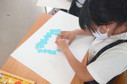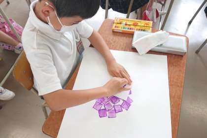 画用紙の枠を使って、四角の形をいくつも描き、パスで色をつけて指でこすります。