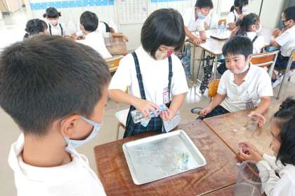 算数科の時間には、10mLのますをいっぱいにして、水を10回入れたらどれぐらいのかさになるのか、実際に水を入れて確かめました。